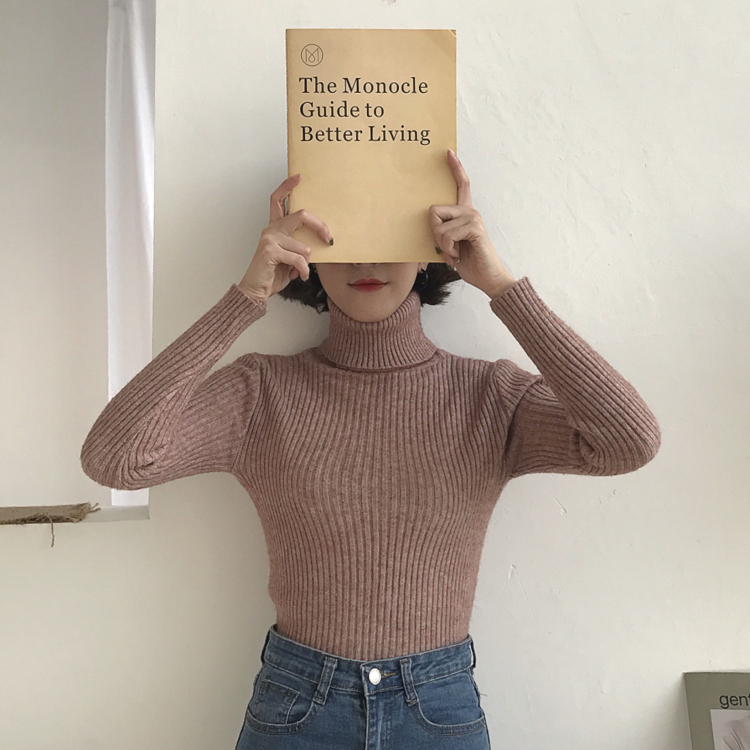 復古韓版chic顯瘦兔絨高領修身五色入加厚保暖百搭坑條打底針織衫