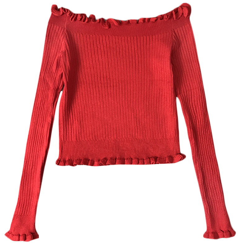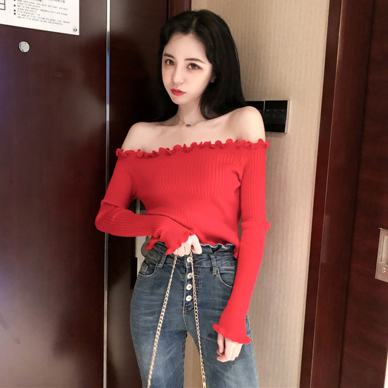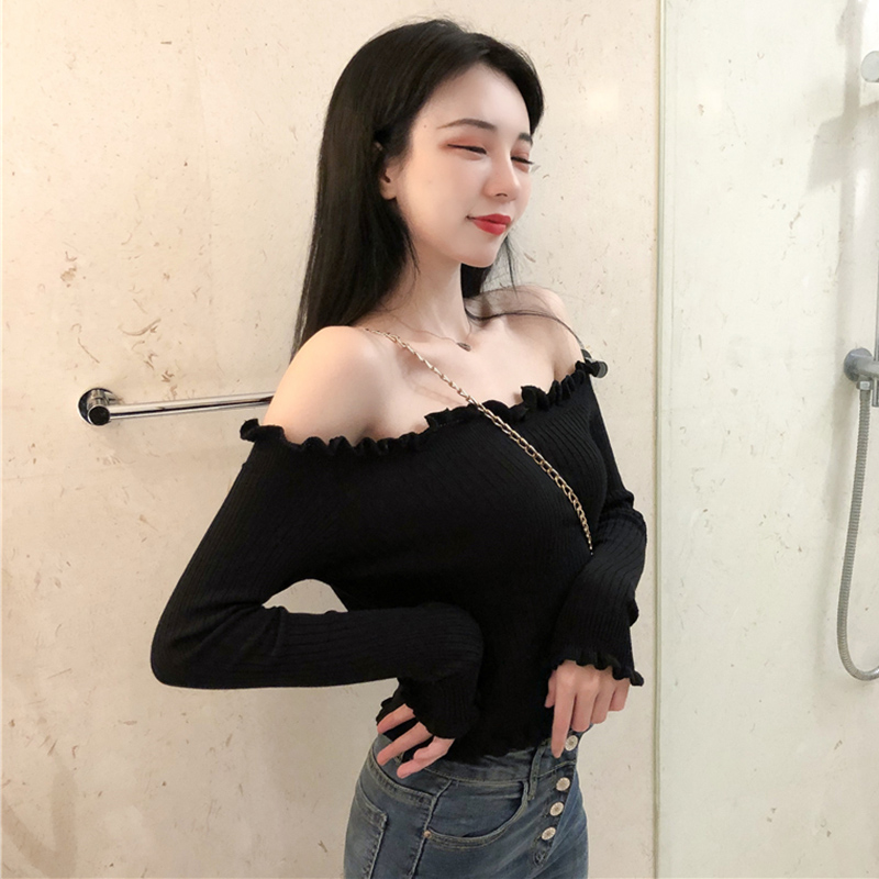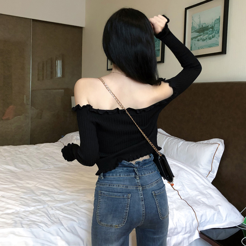秋裝女新款港味心機一字露肩木耳邊長袖針織衫黑色修身氣質短上衣