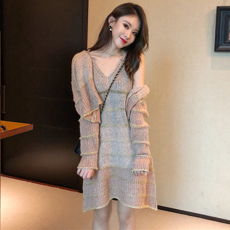 赫本套裝女秋冬新款慵懶長袖針織開衫短外套修身顯瘦吊帶連衣裙子