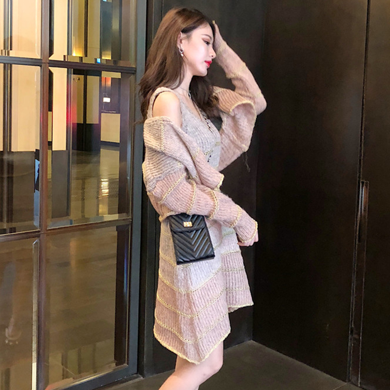 / 赫本套裝女秋冬新款慵懶長袖針織開衫短外套修身顯瘦吊帶連衣裙子
