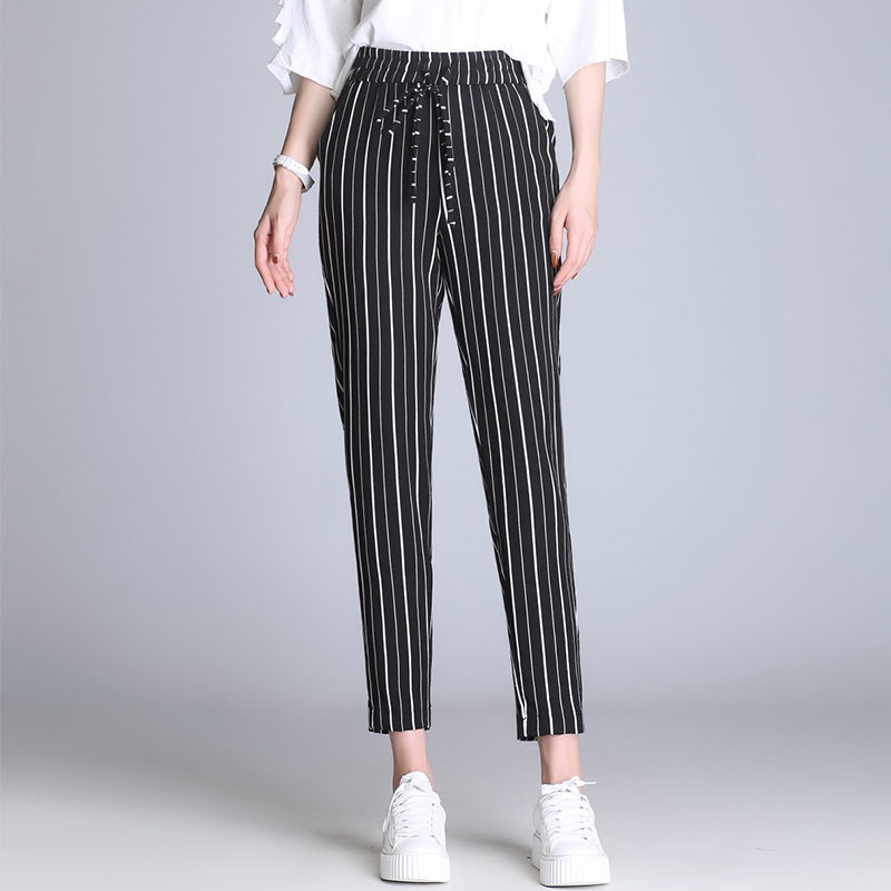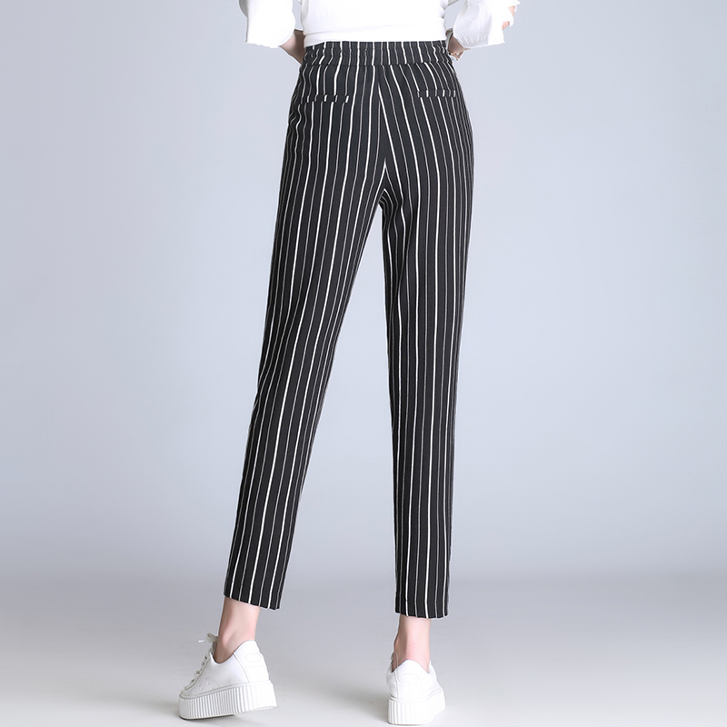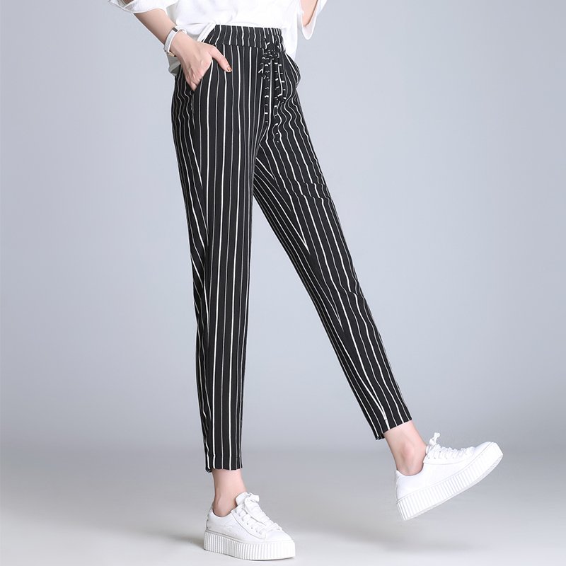 / 蘿卜褲女春夏季韓版寬松百搭顯瘦高腰條紋大碼褲子哈倫褲女九分褲