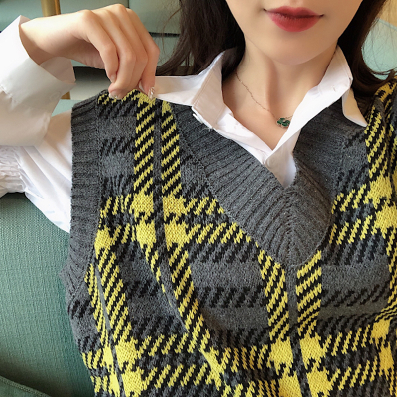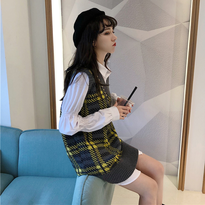 韓版時尚休閑套裝女秋冬新款寬松格子V領針織馬甲中長款翻領襯衫