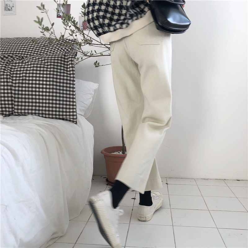 / 秋裝女裝韓版寬松簡約隱形口袋高腰九分褲牛仔褲闊腿褲直筒褲長褲