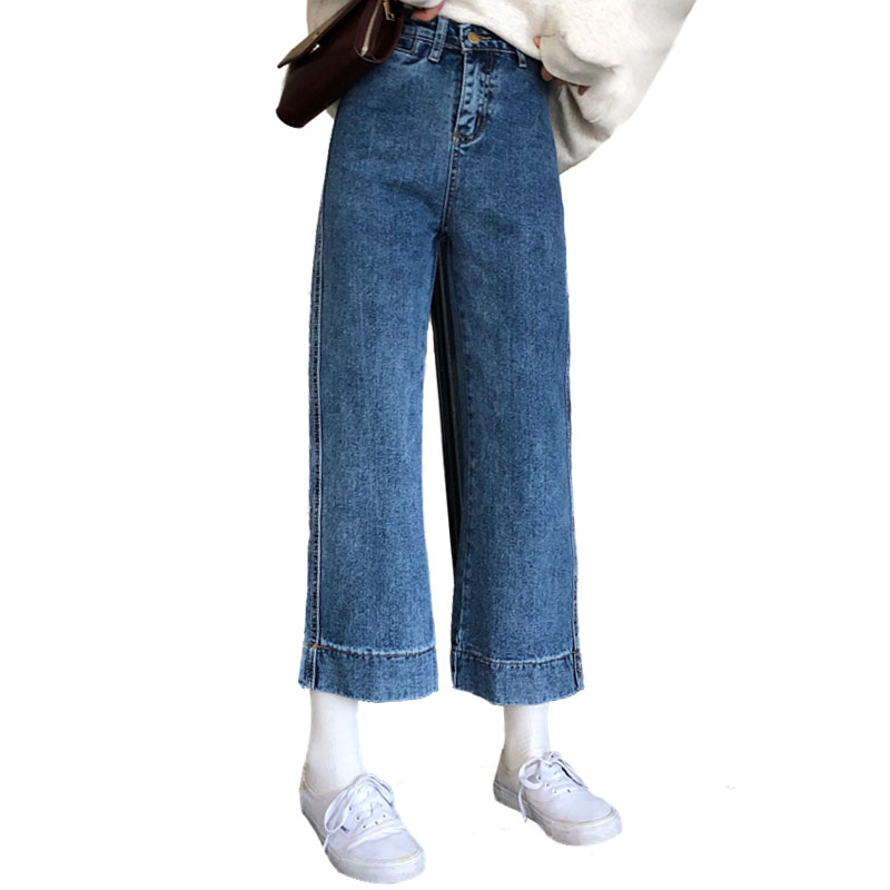 秋裝女裝韓版寬松簡約隱形口袋高腰九分褲牛仔褲闊腿褲直筒褲長褲