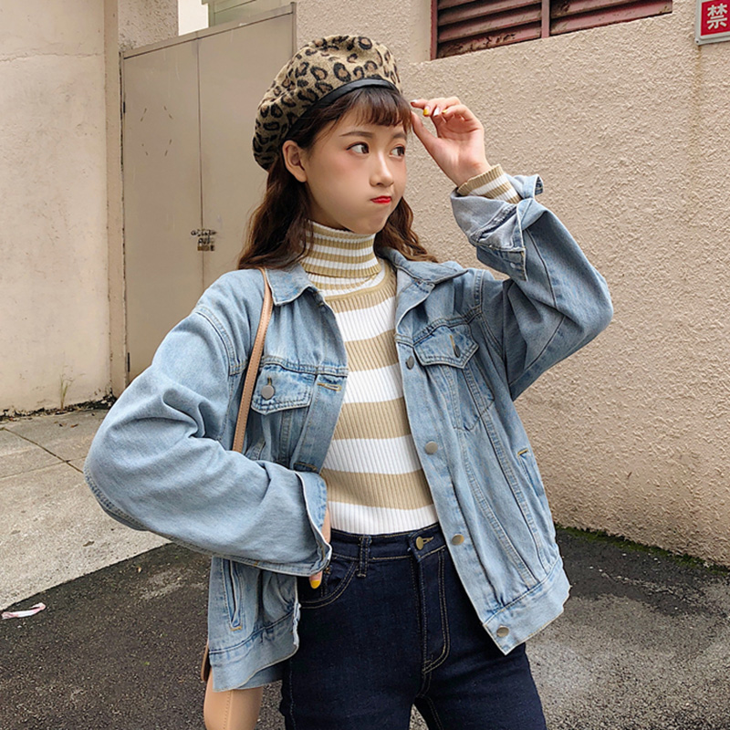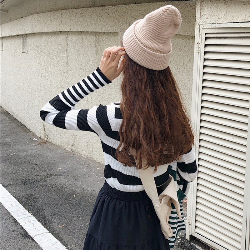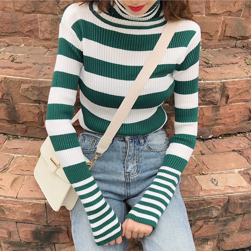 針織衫女韓版秋冬裝2018新款時尚條紋高領長袖T恤修身短款打底衫