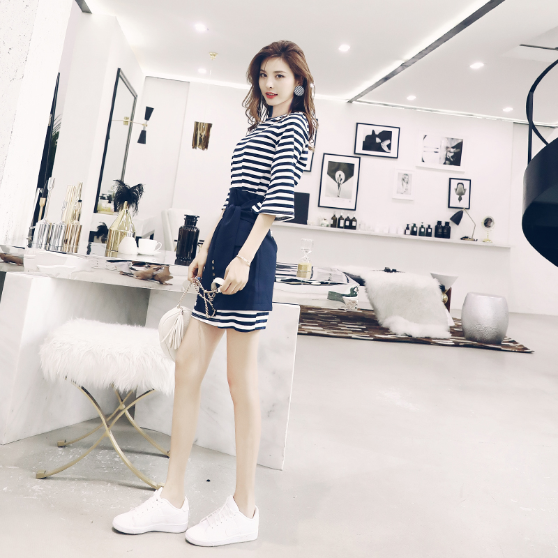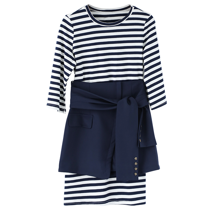 淑女時尚2018秋季新款條紋連衣裙兩件套chic風收腰顯瘦氣質套裝
