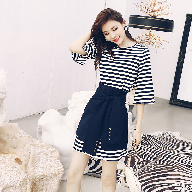 / 淑女時尚2018秋季新款條紋連衣裙兩件套chic風收腰顯瘦氣質套裝