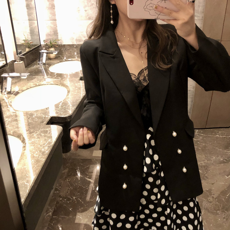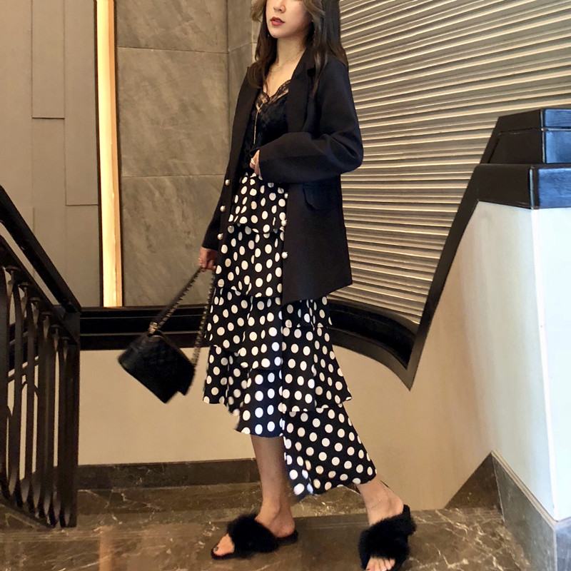 2018秋裝新款韓版套裝女珍珠扣西裝外套前短后長波點蛋糕裙兩件套