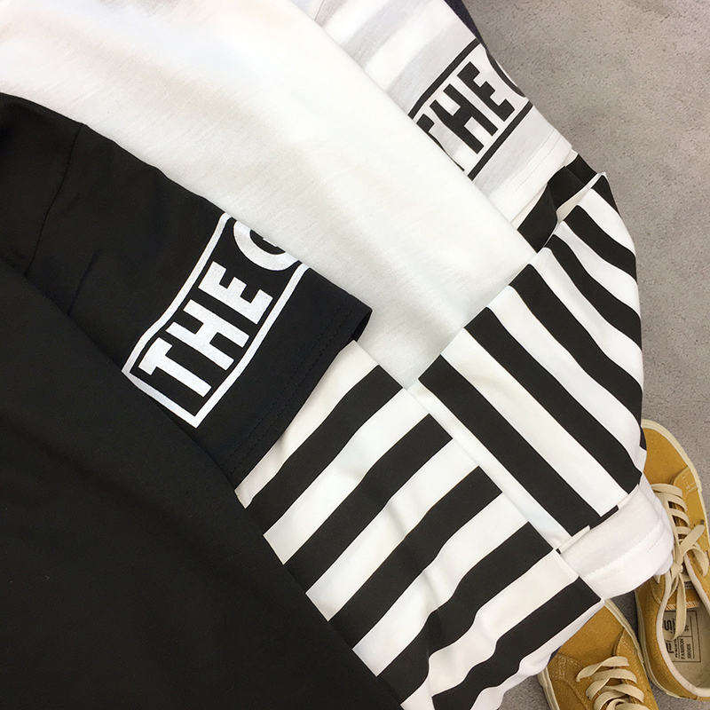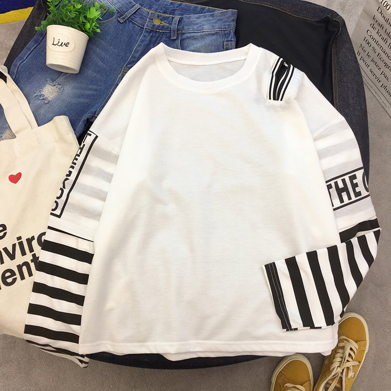 / 時尚條紋拼接假兩件上衣女秋裝新款字母印花長袖體恤寬松休閑T恤