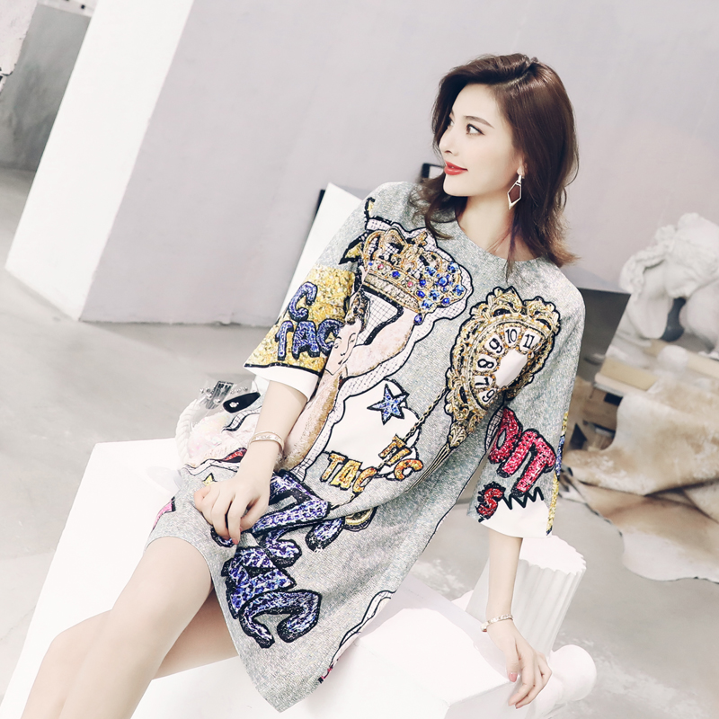 2018夏裝新款時尚五分袖復古重工釘珠印花T恤女韓版寬松中長款裙