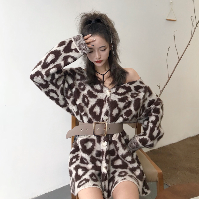 秋冬新款韓版加厚保暖時尚單排扣女裝豹紋網紅毛衣開衫外套配腰帶