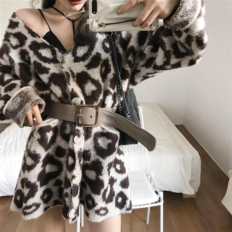 / 秋冬新款韓版加厚保暖時尚單排扣女裝豹紋網紅毛衣開衫外套配腰帶