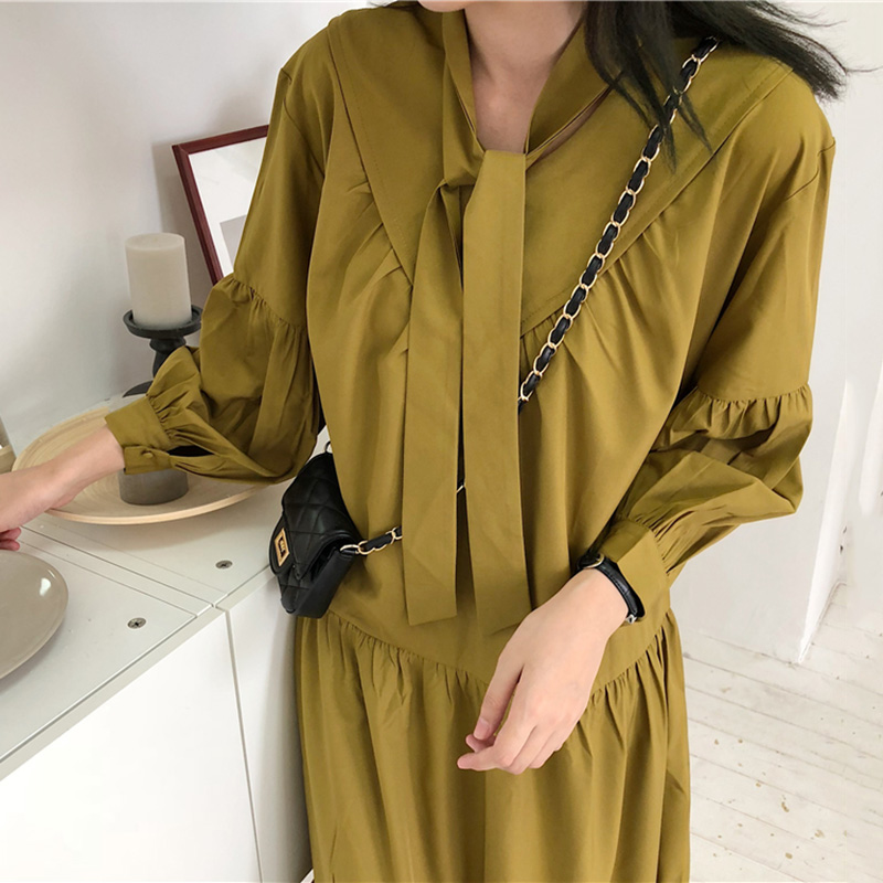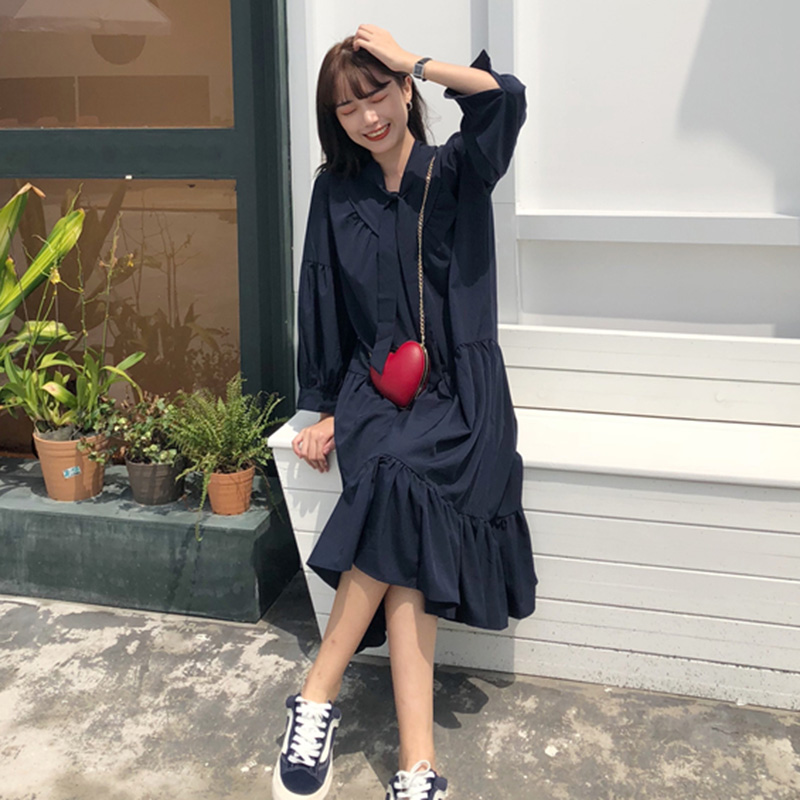 / 清新荷葉邊中長A字裙秋裝女2018新款韓版寬松系帶燈籠袖連衣裙子