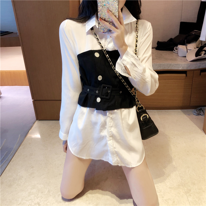 秋天上衣女新款襯衫女長袖女韓范百搭撞色個性系帶收腰顯瘦襯衣女