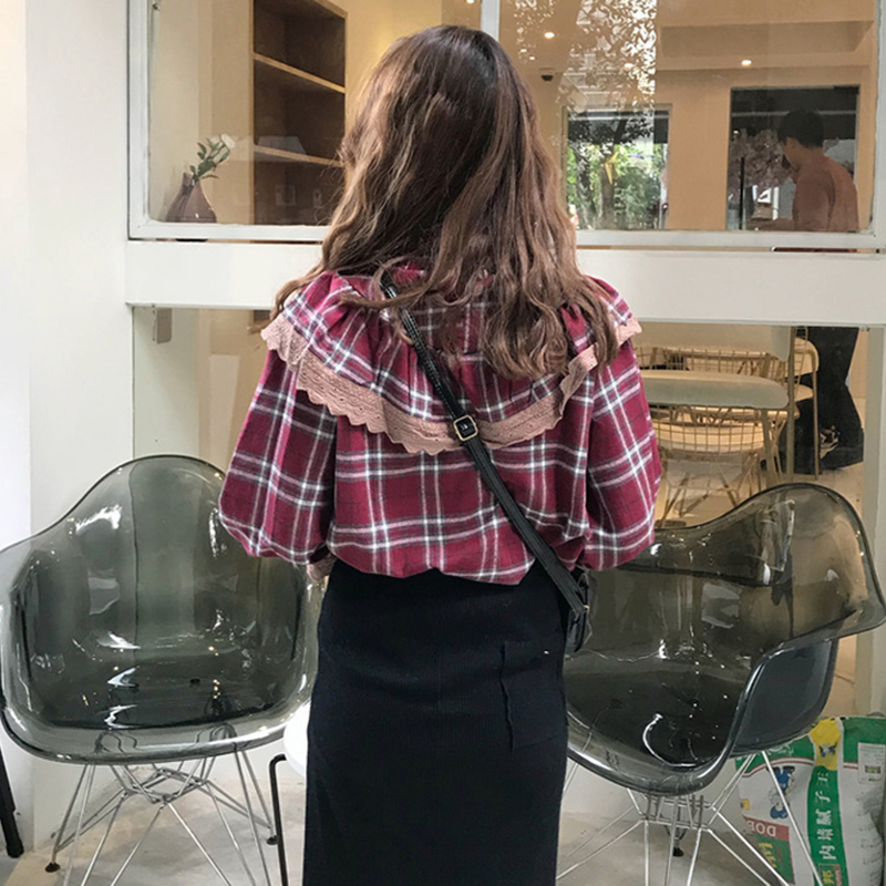 / 秋裝女2018新款復古荷葉邊立領格子襯衫學生休閑燈籠長袖寬松上衣