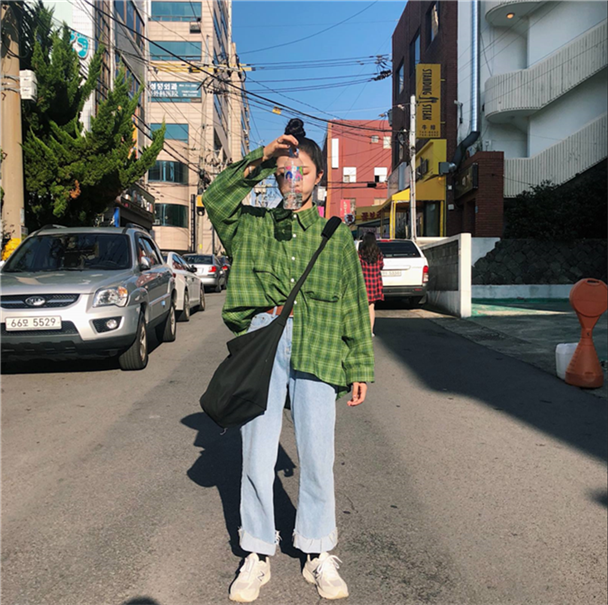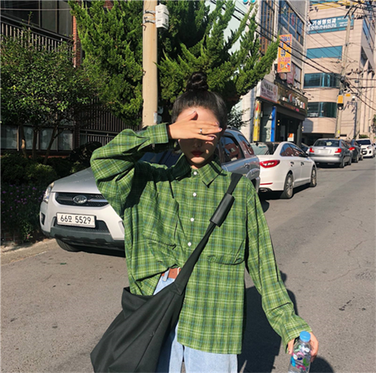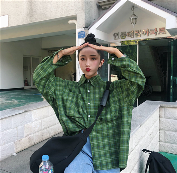/ 秋季女裝韓版復古港風綠格子中長款BF風寬松長袖休閑襯衫上衣外套