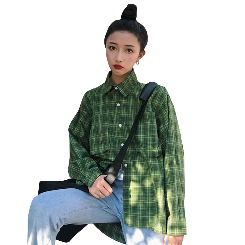 秋季女裝韓版復古港風綠格子中長款BF風寬松長袖休閑襯衫上衣外套