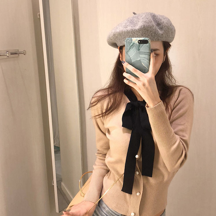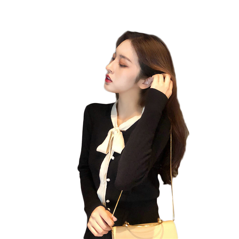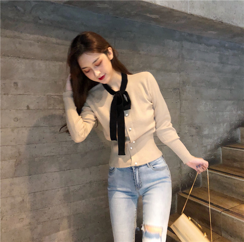 / 韓版秋裝女2018新款時尚百搭蝴蝶結開衫長袖短款外搭修身針織外套