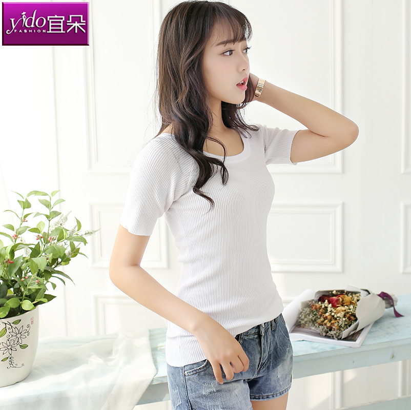 / 白色針織t恤女短款中袖圓領春夏薄款針織衫上衣女薄針織打底衫女