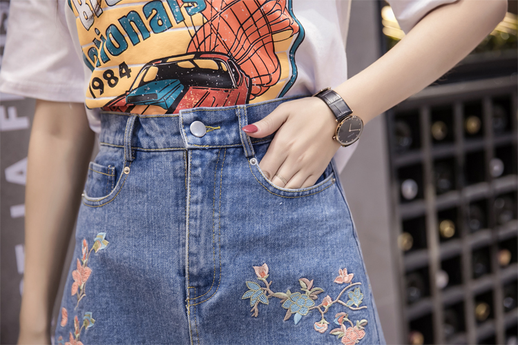 / 韓版高腰繡花牛仔裙半身裙女包臀短裙A字裙刺繡防走光褲裙半裙夏