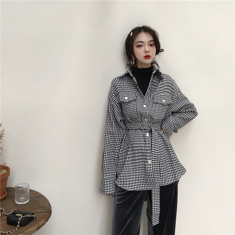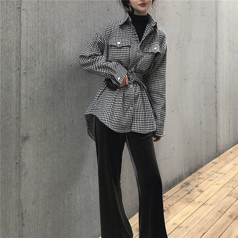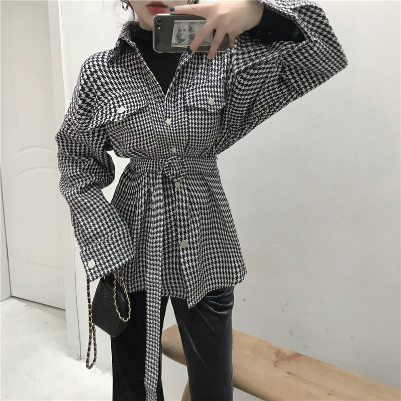 冬裝新款chic風復古韓版慵懶寬松加厚千鳥格毛呢外套女上衣配腰帶