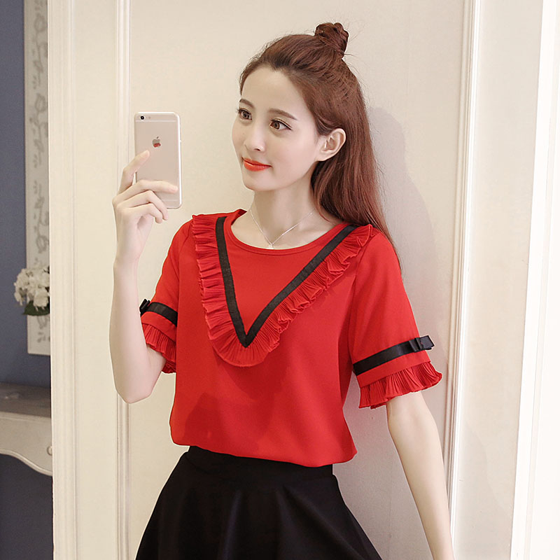 / 夏裝新款小清新女裝短袖雪紡衫女圓領韓版甜美木耳邊襯衫上衣