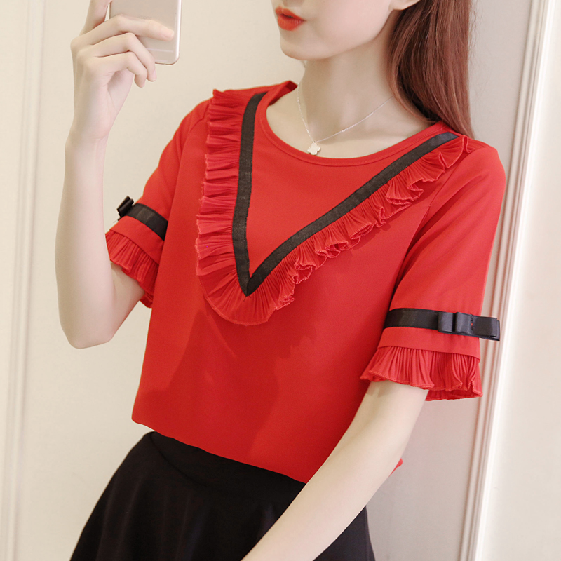 夏裝新款小清新女裝短袖雪紡衫女圓領韓版甜美木耳邊襯衫上衣