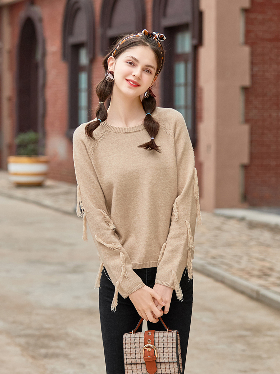 MG小象純色套頭毛衣女冬季2018新款學生圓領上衣流蘇針織毛線衣潮
