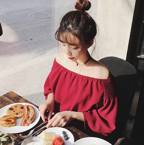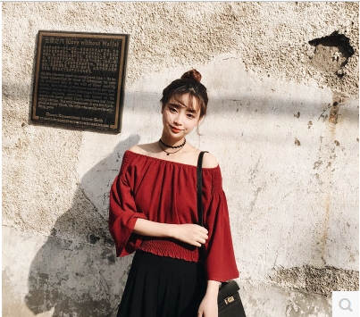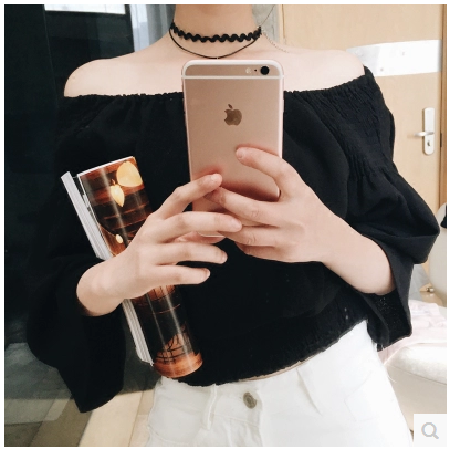 / 2017夏裝新款韓版一字領純色寬松短款打底雪紡衫上衣女裝夏季