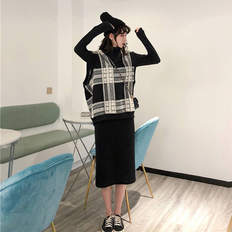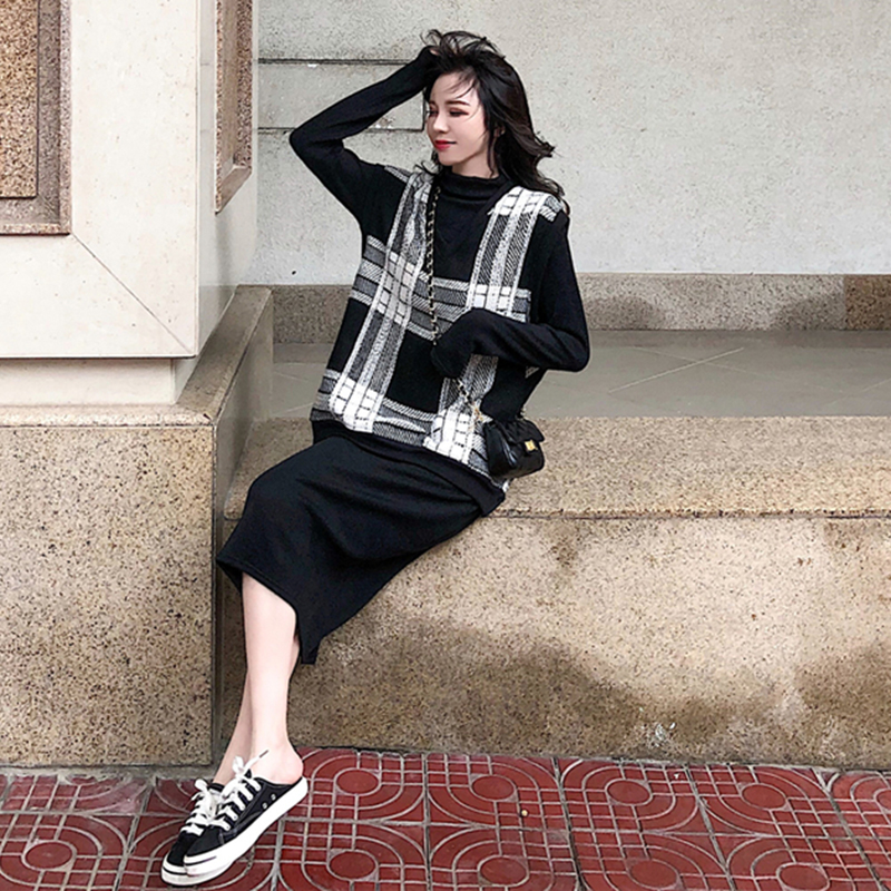 / 韓版時尚套裝女秋冬新款寬松V領毛呢馬甲修身中長款針織連衣裙子