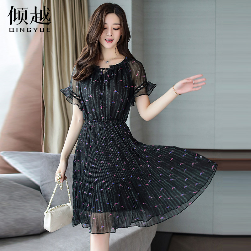 / 氣質淑女碎花百褶雪紡連衣裙喇叭袖2017新款收腰顯瘦小花裙子夏潮