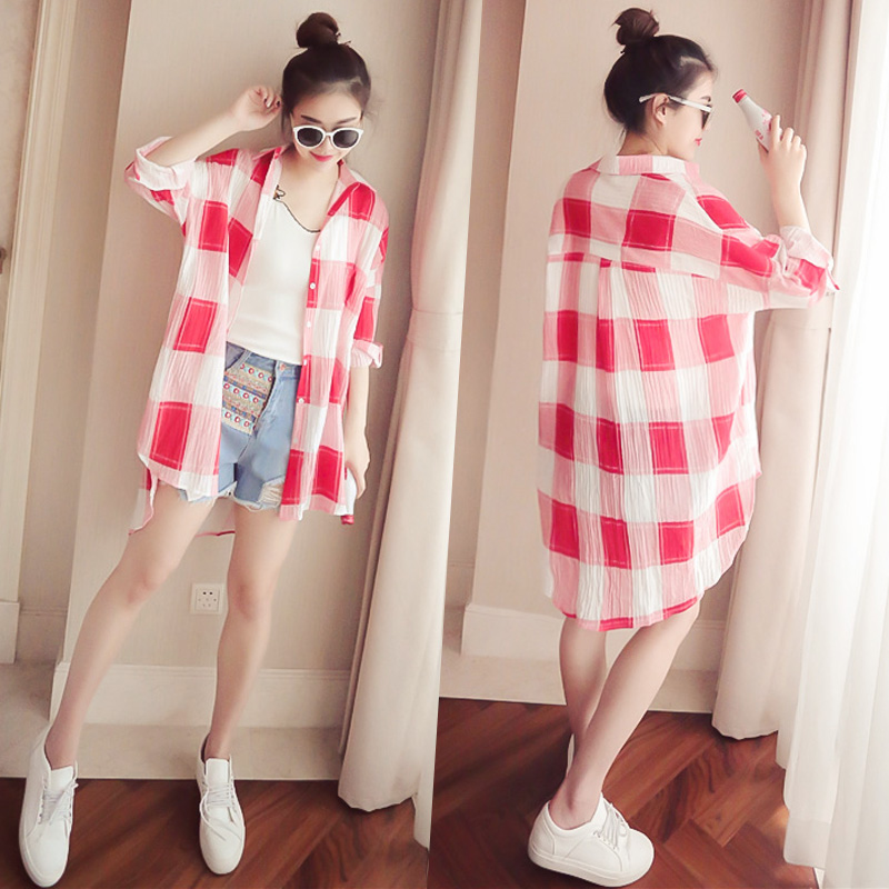 韓版新款夏季百搭大碼寬松中長款格子襯衫沙灘防曬衣薄外套開衫女