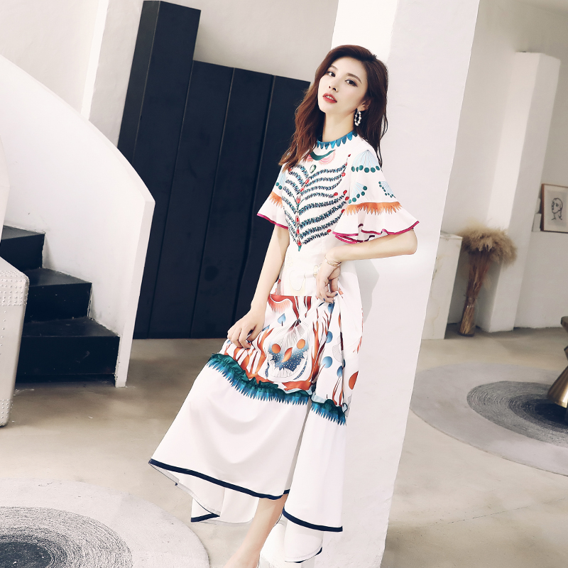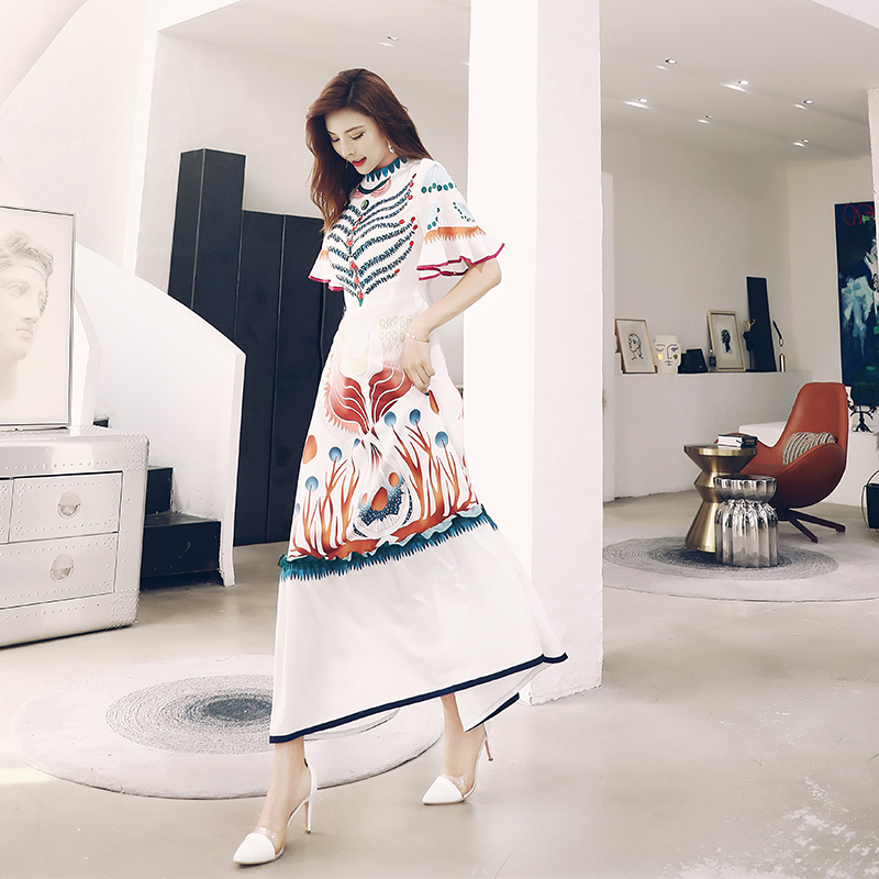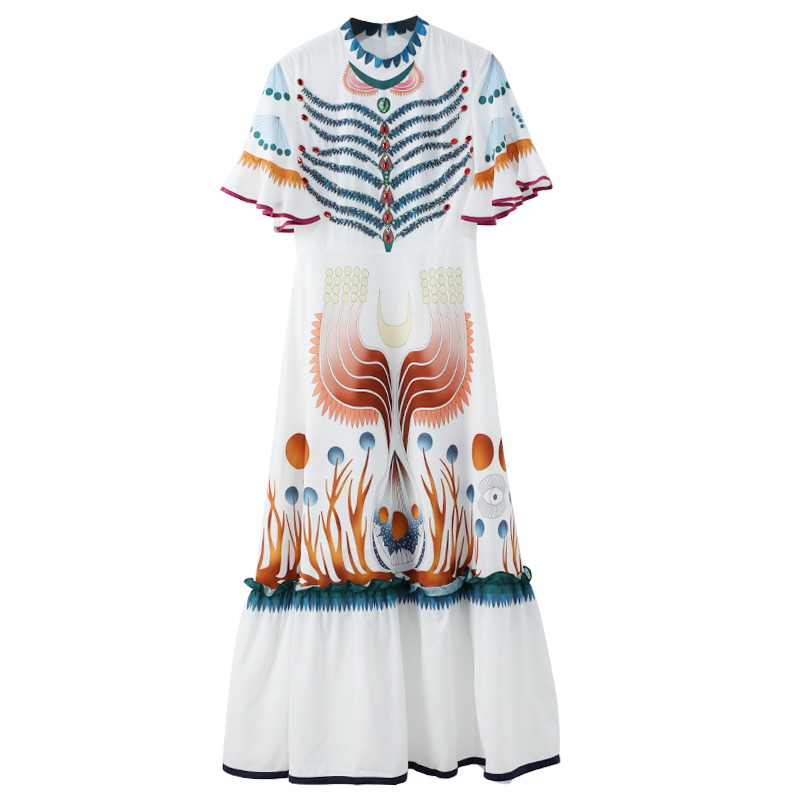 / 復古短袖夏秋季女2018新款民族釘鉆雪紡荷葉印花大擺長裙連衣裙子