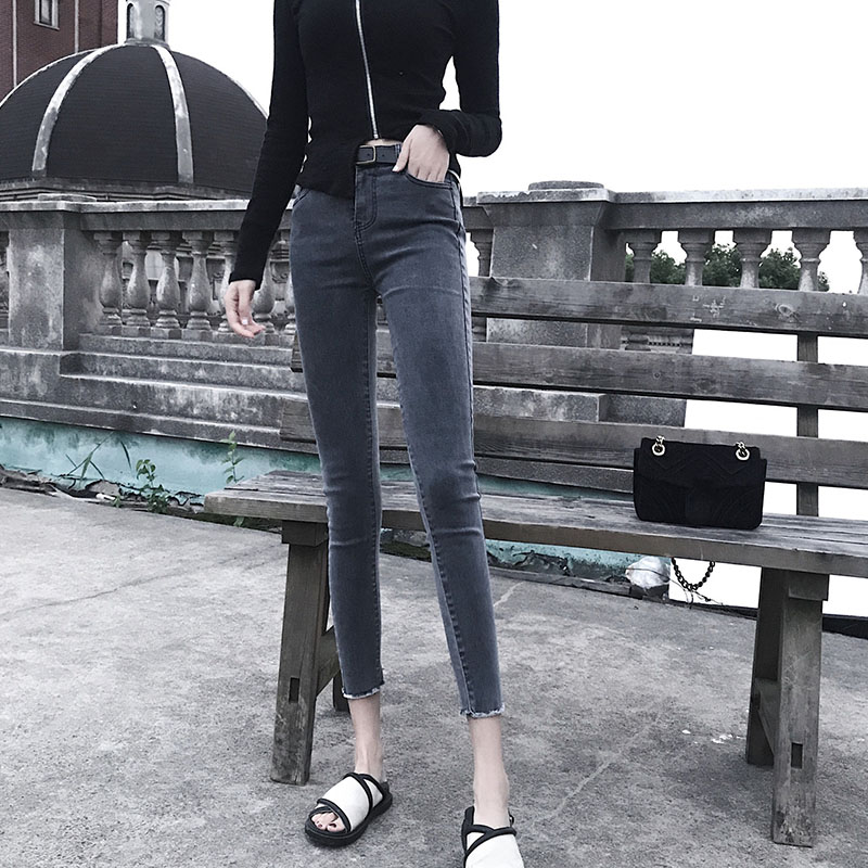 港味復古chic褲子煙灰色破洞高腰顯瘦毛邊牛仔九分小腳褲鉛筆褲潮