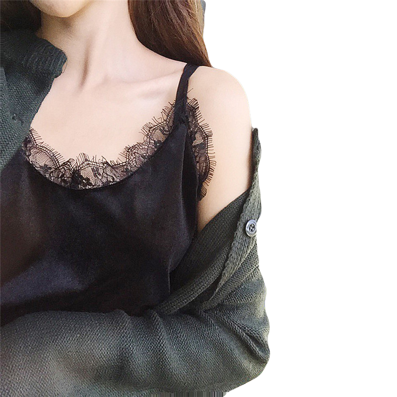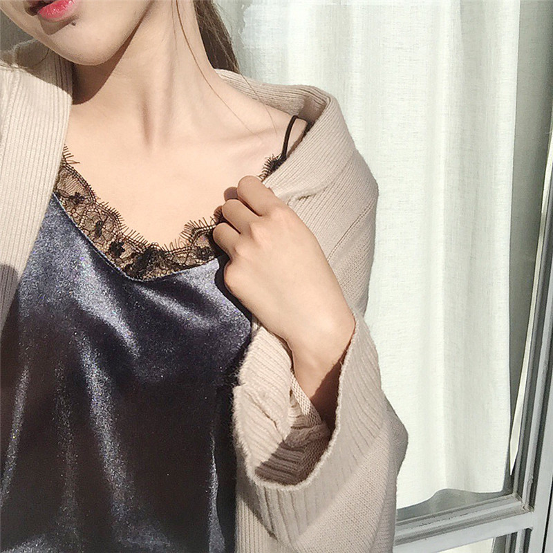/ 韓國chic春裝打底衫蕾絲花邊拼接V領百搭絲絨吊帶小背心女