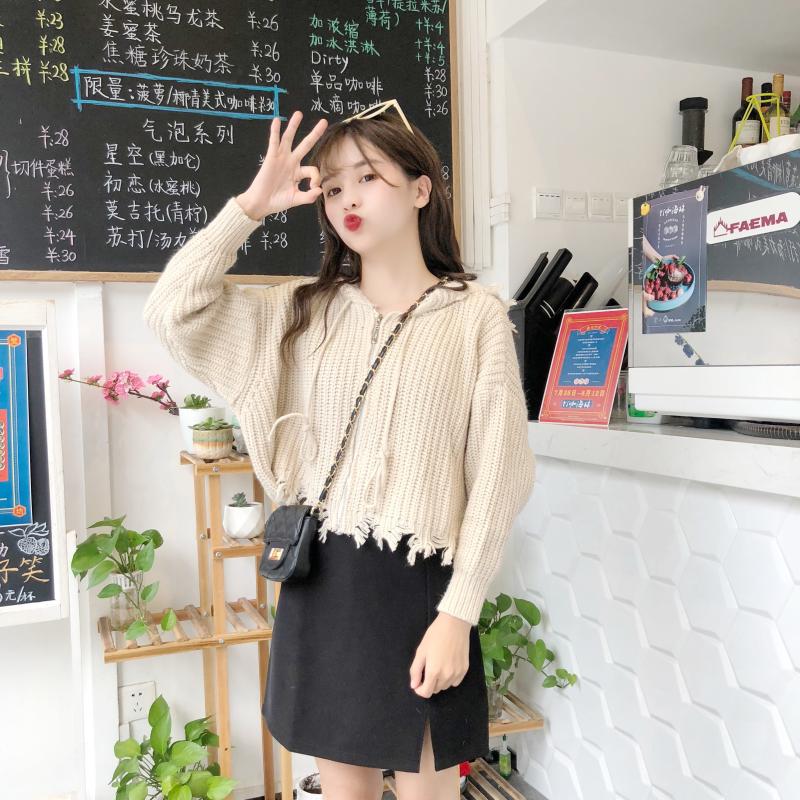 / 秋季女裝韓版連帽短款不規則粗線拉鏈毛衣外套寬松長袖針織衫上衣