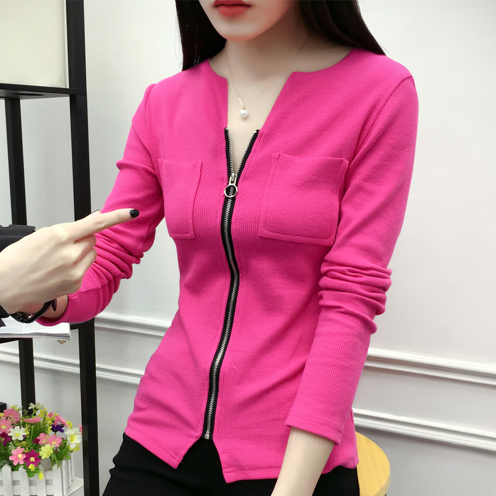 春秋新款女裝棉質V領長袖T恤衫大碼修身打底衫女體恤上衣