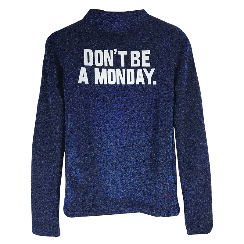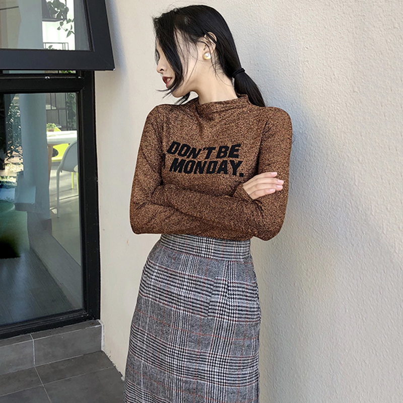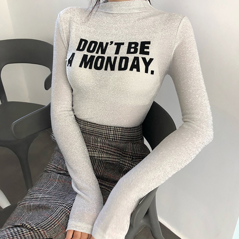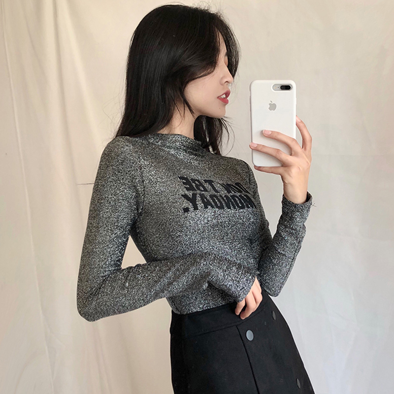 / 閃閃亮絲字母半高領長袖打底衫女韓版修身顯瘦T恤秋裝新款上衣潮