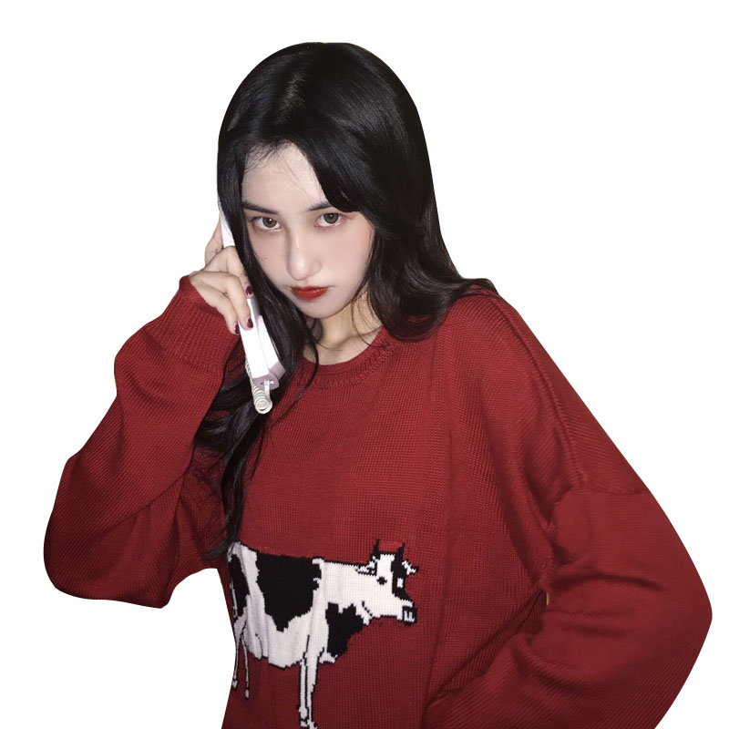 / 秋冬女裝韓版寬松卡通奶牛卷邊紅色網紅套頭針織衫毛衣上衣外套潮