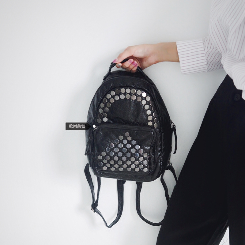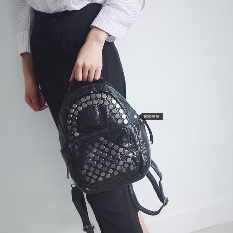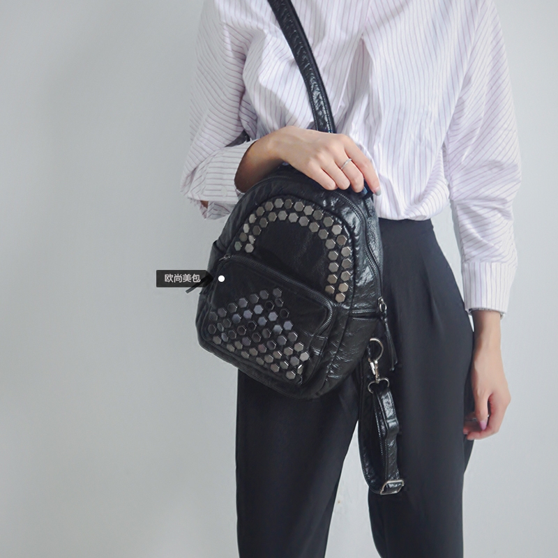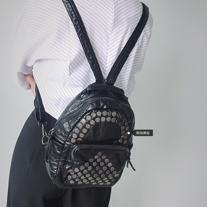 新款水洗皮鉚釘雙肩包女休閑背包韓版時尚旅行小包包學院風潮