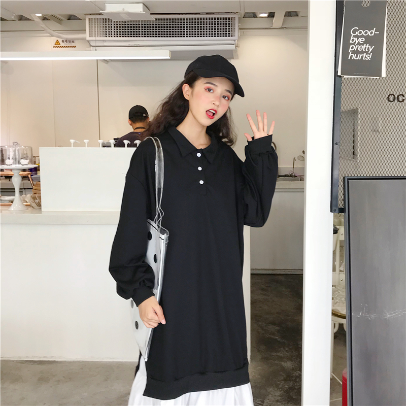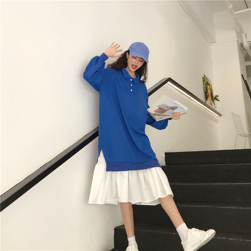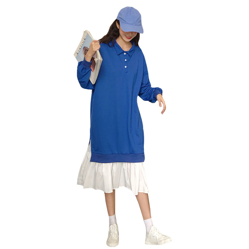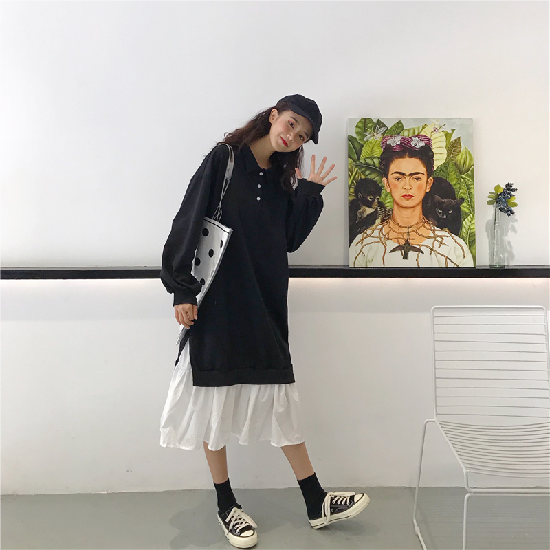 / 秋季韓版氣質中長款Polo領拼色下擺拼接寬松顯瘦長袖連衣裙長裙女