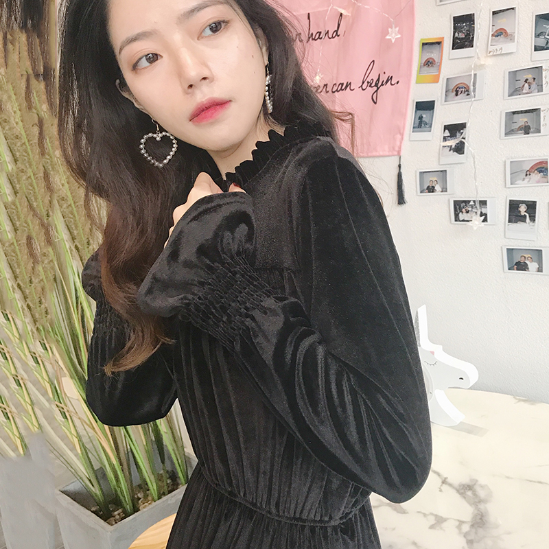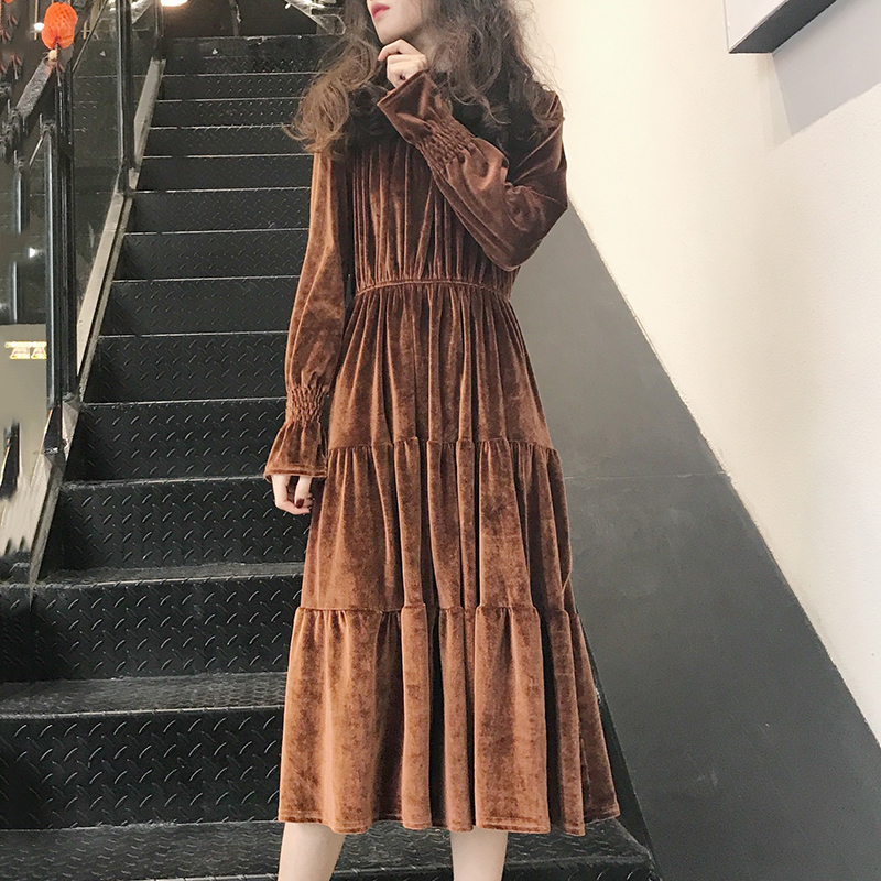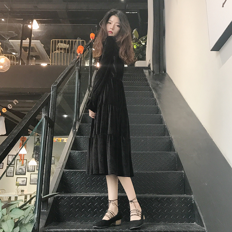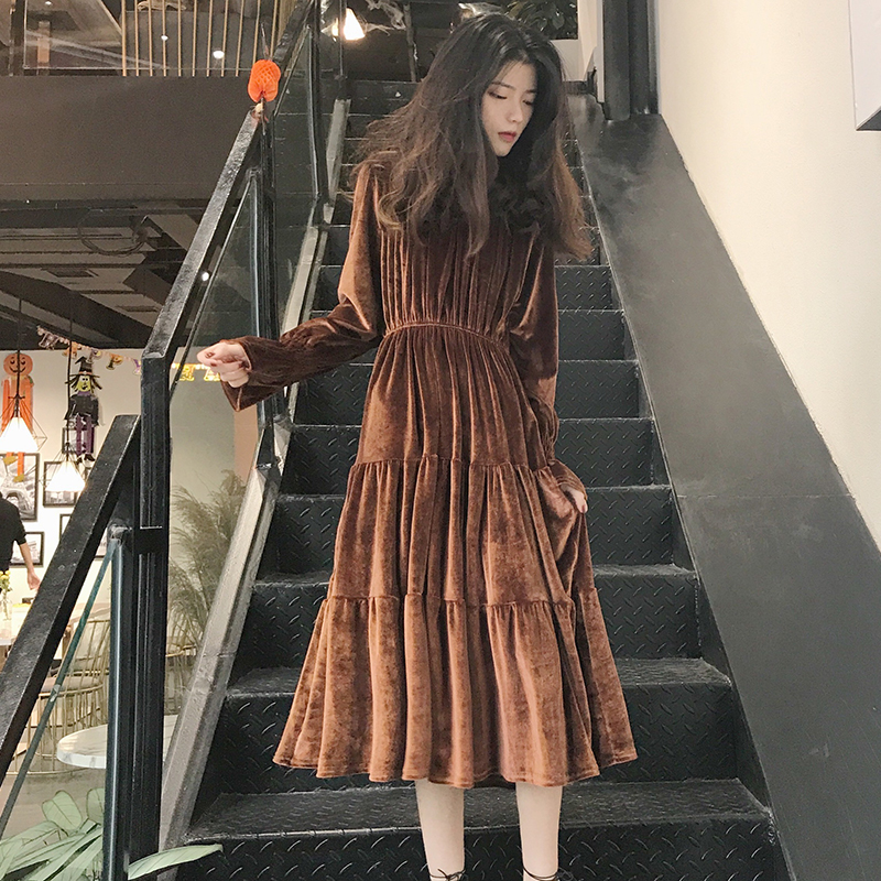 / 氣質a字連衣裙秋裝女新款花苞圓領喇叭袖大擺裙顯瘦絲絨蛋糕裙子