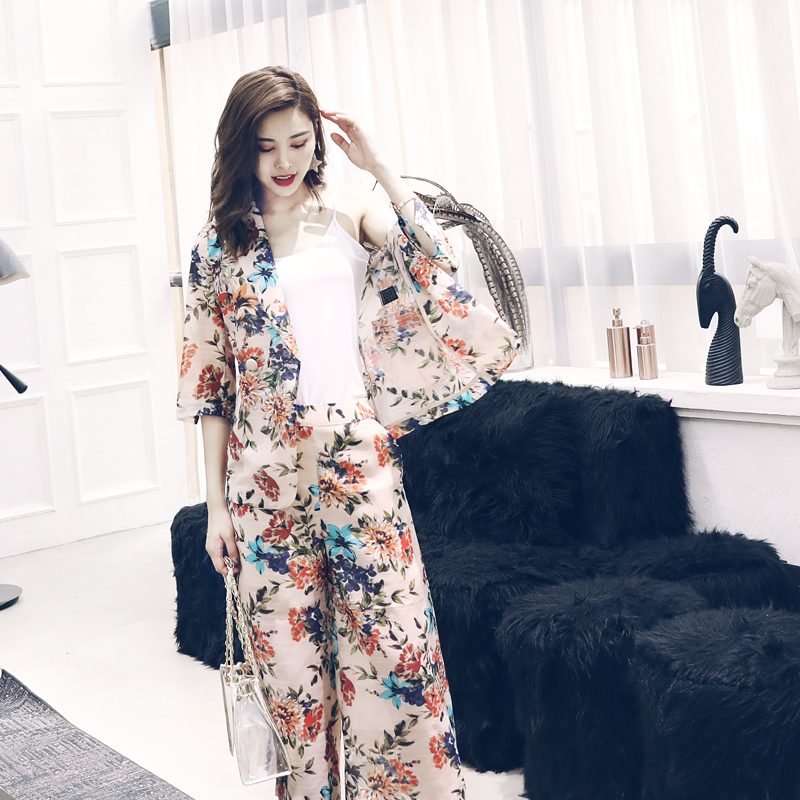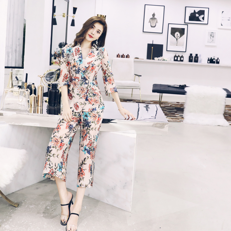 歐洲站小西裝女套裝2018新款時尚復古印花西服外套小腳褲時髦套裝