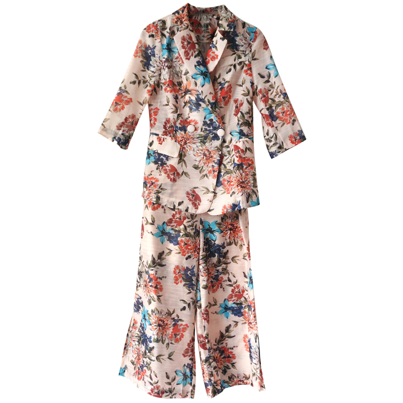 / 歐洲站小西裝女套裝2018新款時尚復古印花西服外套小腳褲時髦套裝