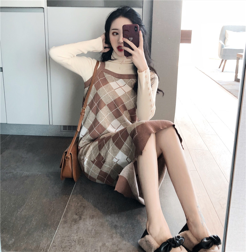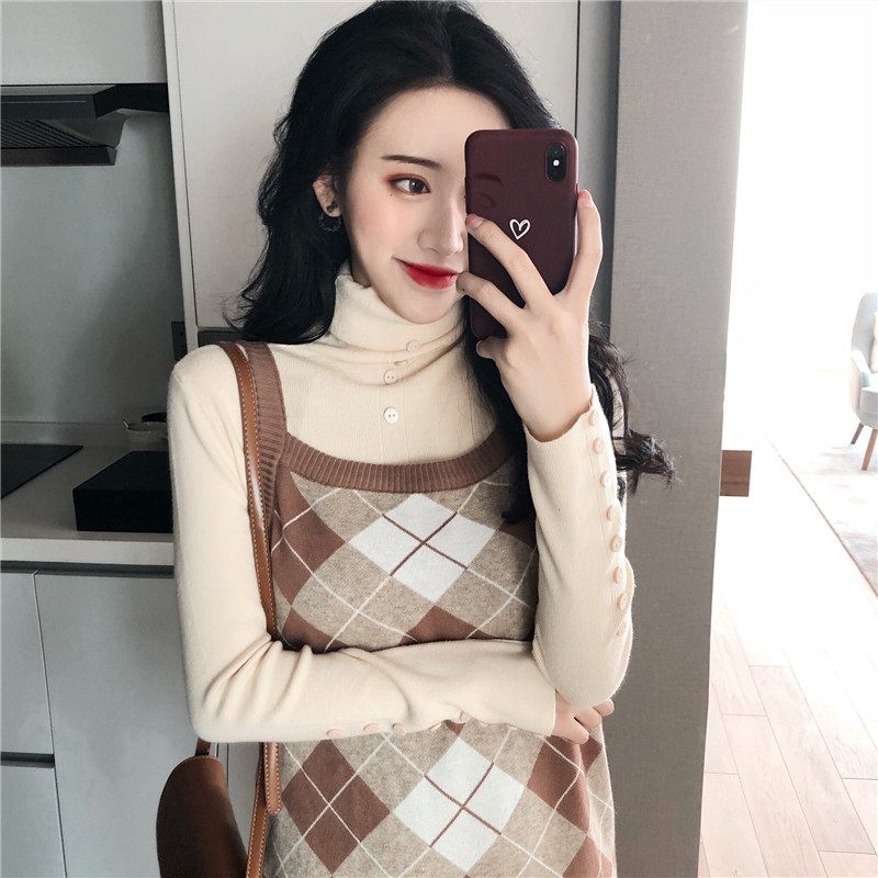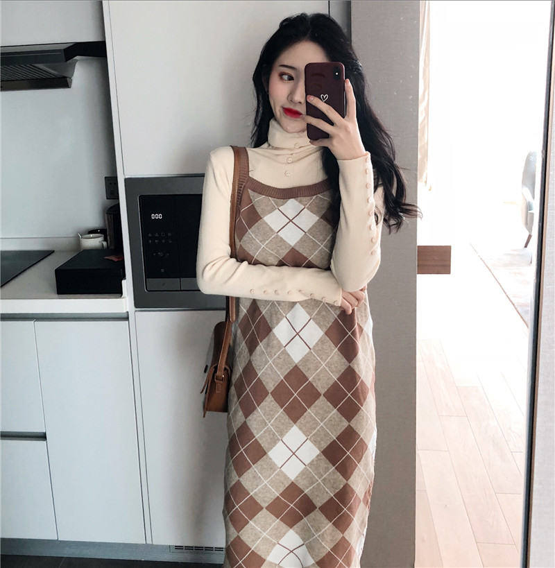 復古女神套裝秋冬新款港味排扣打底針織衫+菱格吊帶針織連衣裙女