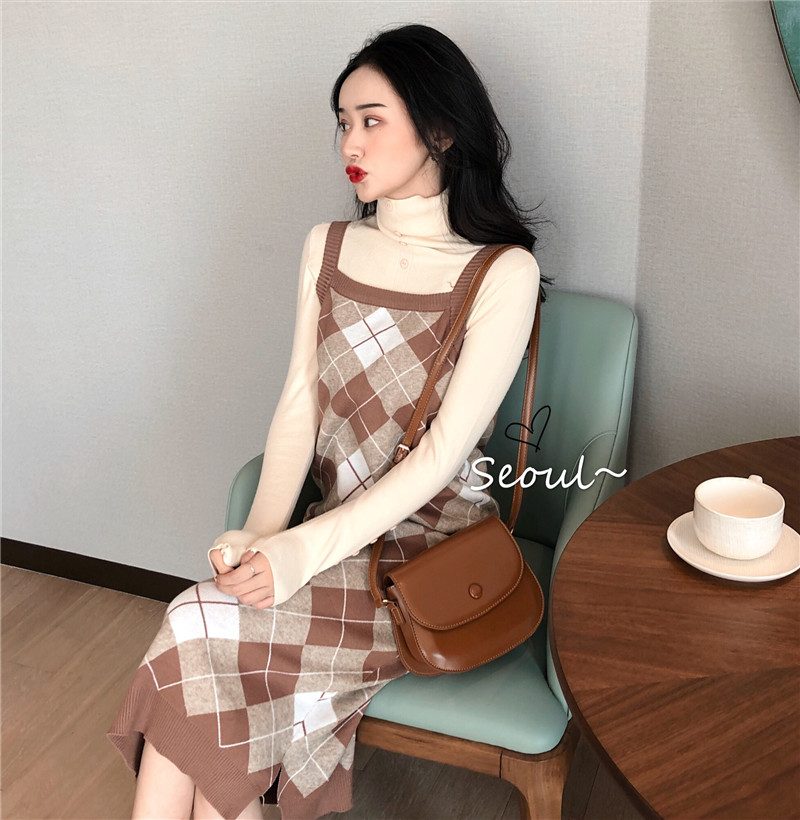 / 復古女神套裝秋冬新款港味排扣打底針織衫+菱格吊帶針織連衣裙女