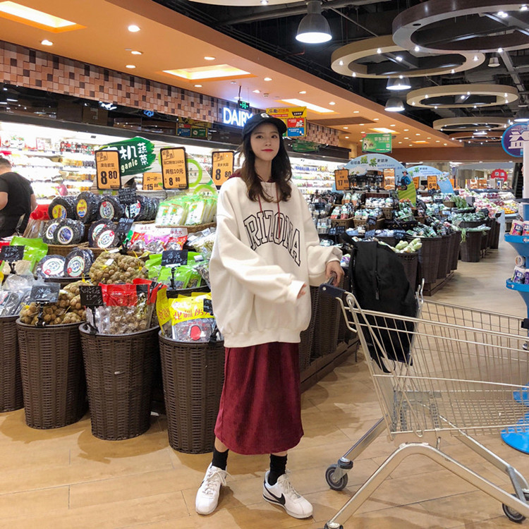 / 韓版時尚休閑套裝秋冬女裝字母刺繡連帽加絨衛衣+半身長裙兩件套