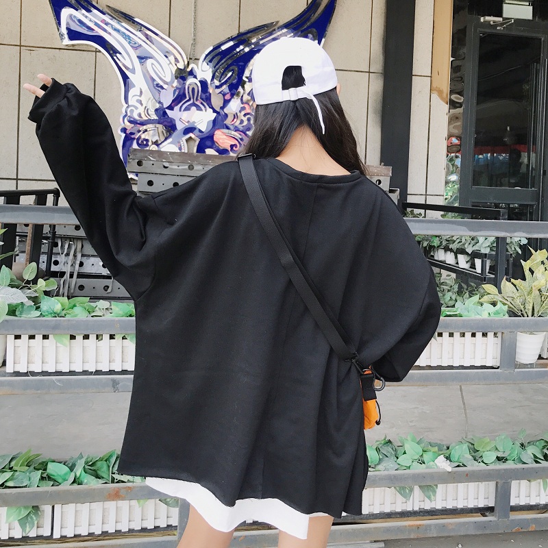 春季女裝新款韓版原宿風撞色破洞拼接假兩件上衣學生寬松休閑衛衣