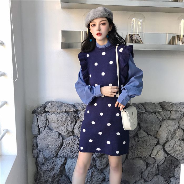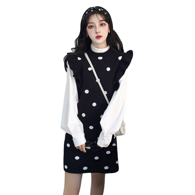/ 長袖寬松顯瘦打底衫木耳邊波點加厚針織背心裙秋冬時尚套裝兩件套