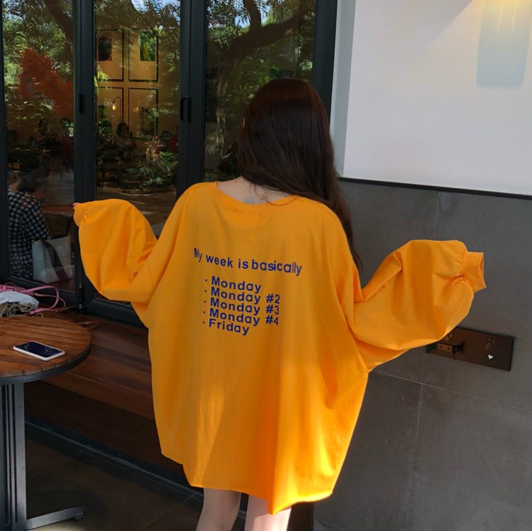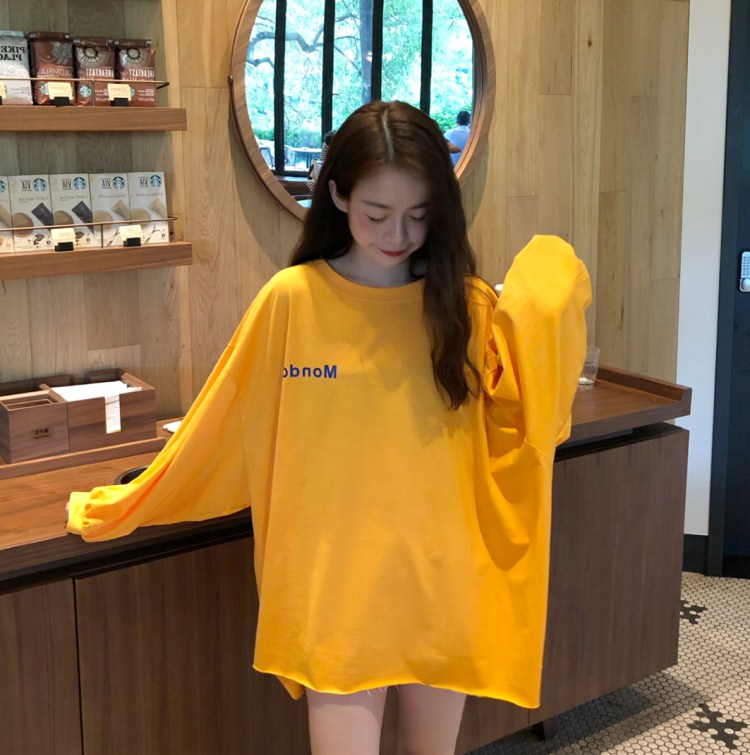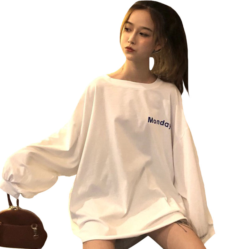 秋裝女裝韓版寬松字母印花長袖T恤中長款休閑百搭體恤顯瘦上衣潮